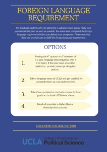 If you have satisfied your foreign language requirement, please fill out this form below and send it to Esther Blair or Annie Carpenter as soon as possible: https://grad.ucla.edu/gasaa/library/lngpetition.pdf. Please remember to attach your transcript/paperwork showing how you satisfied the requirement. If you are using your native language to satisfy it, no additional paperwork is needed (beyond the form).